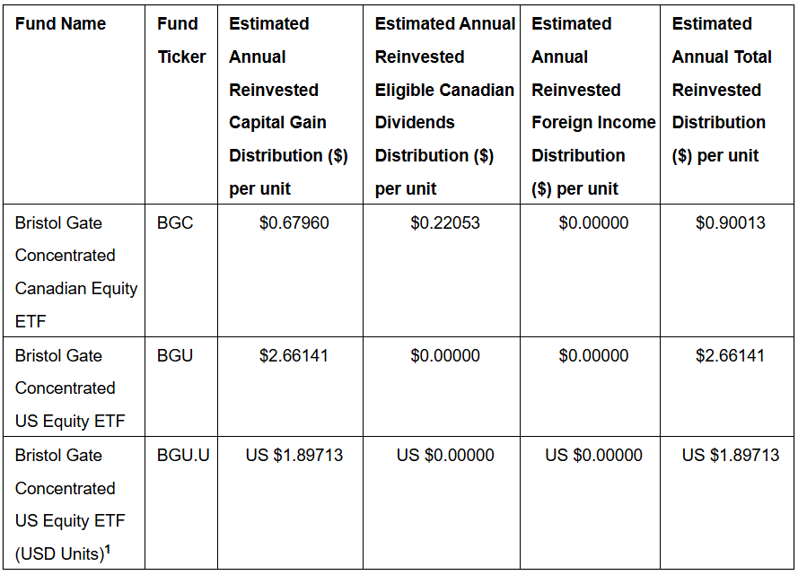 All values are expressed in Canadian dollars, unless otherwise indicated. The estimated 2025 annual per-unit reinvested distributions for the Bristol Gate ETFs are as follows: